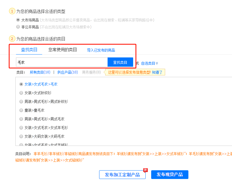 不清楚自己产品的类目,可以在发布产品时“查找类目”