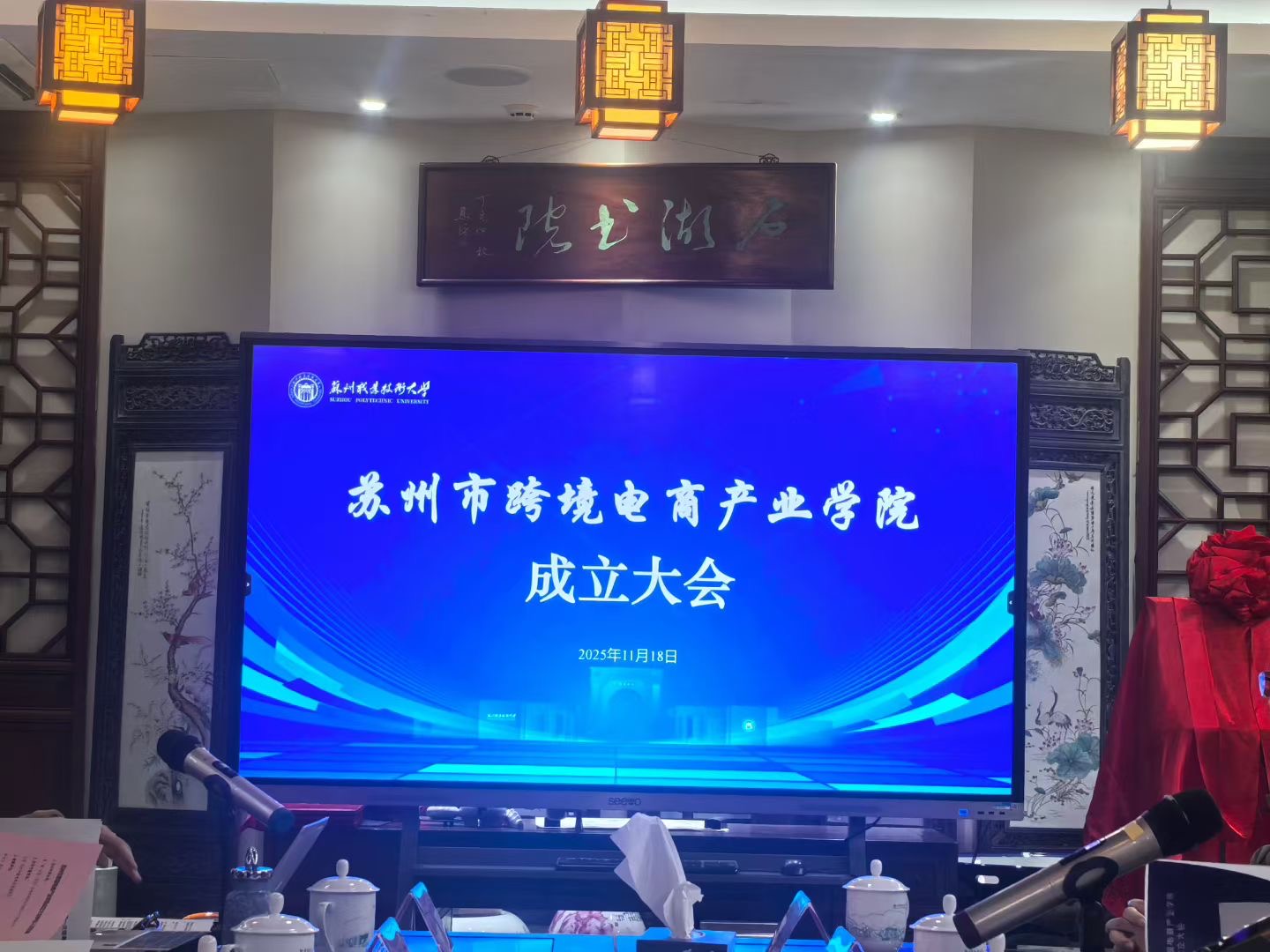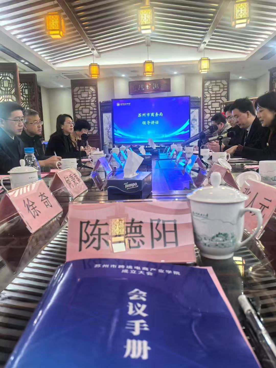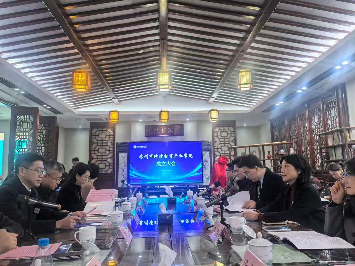 苏州市跨境电商产业学院成立大会今天举行,苏州职业技术大学孙学文副校长当选第一届理事长,金迅博集团陈德阳董事长当选首任院长。